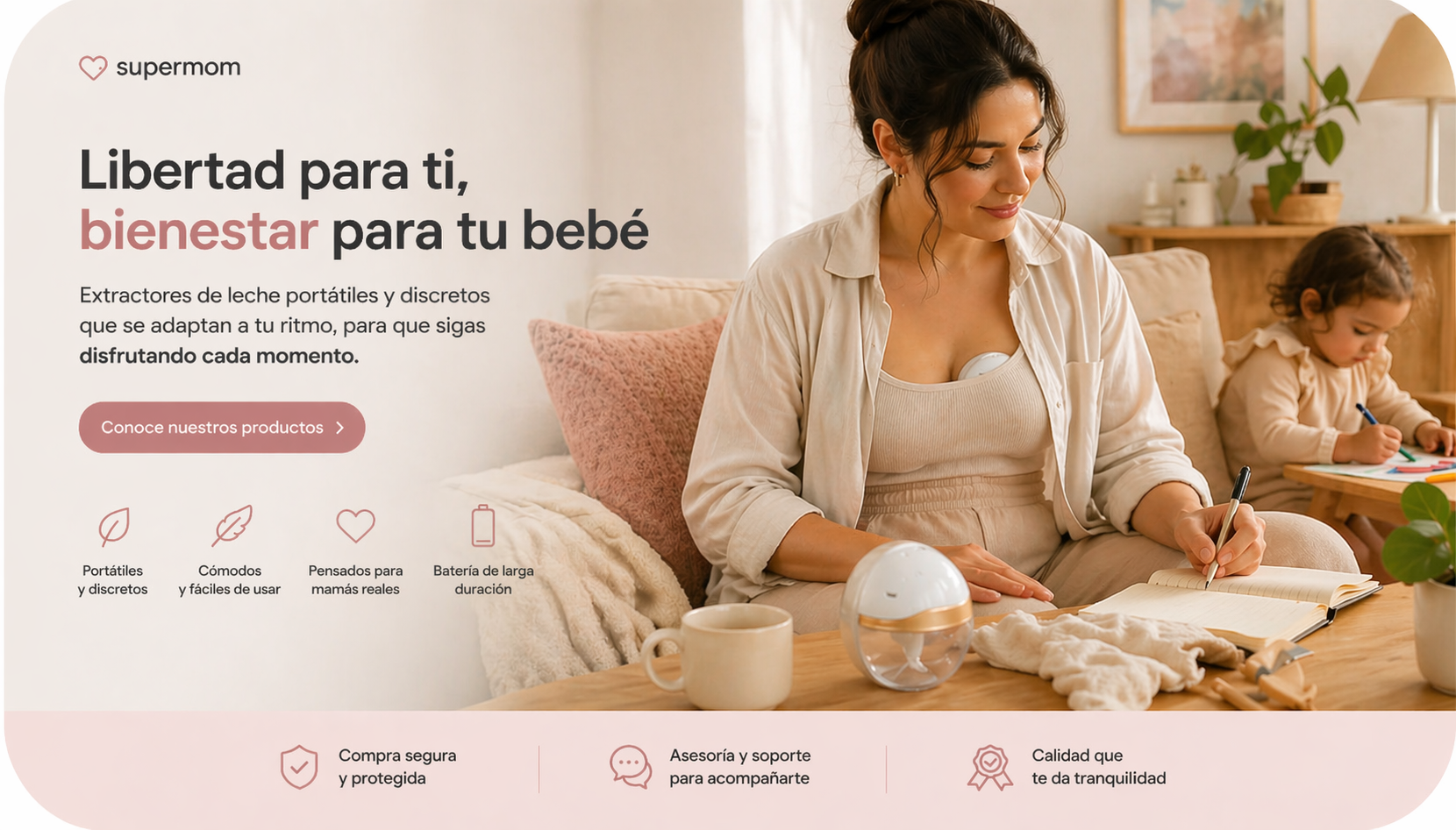 Es una caja que trae todo lo que no sabías que ibas a necesitar, porque el autocuidado postparto es fundamental para el bienestar físico y mental de una mamá. Cuando sientas que todo está en llamas por ahí abajo, no te preocupes porque Super Mom pensó en eso.